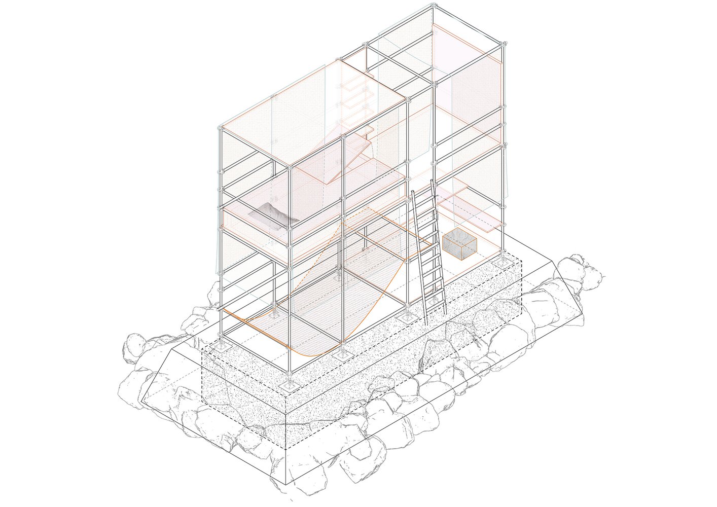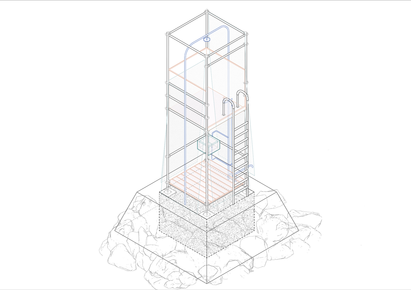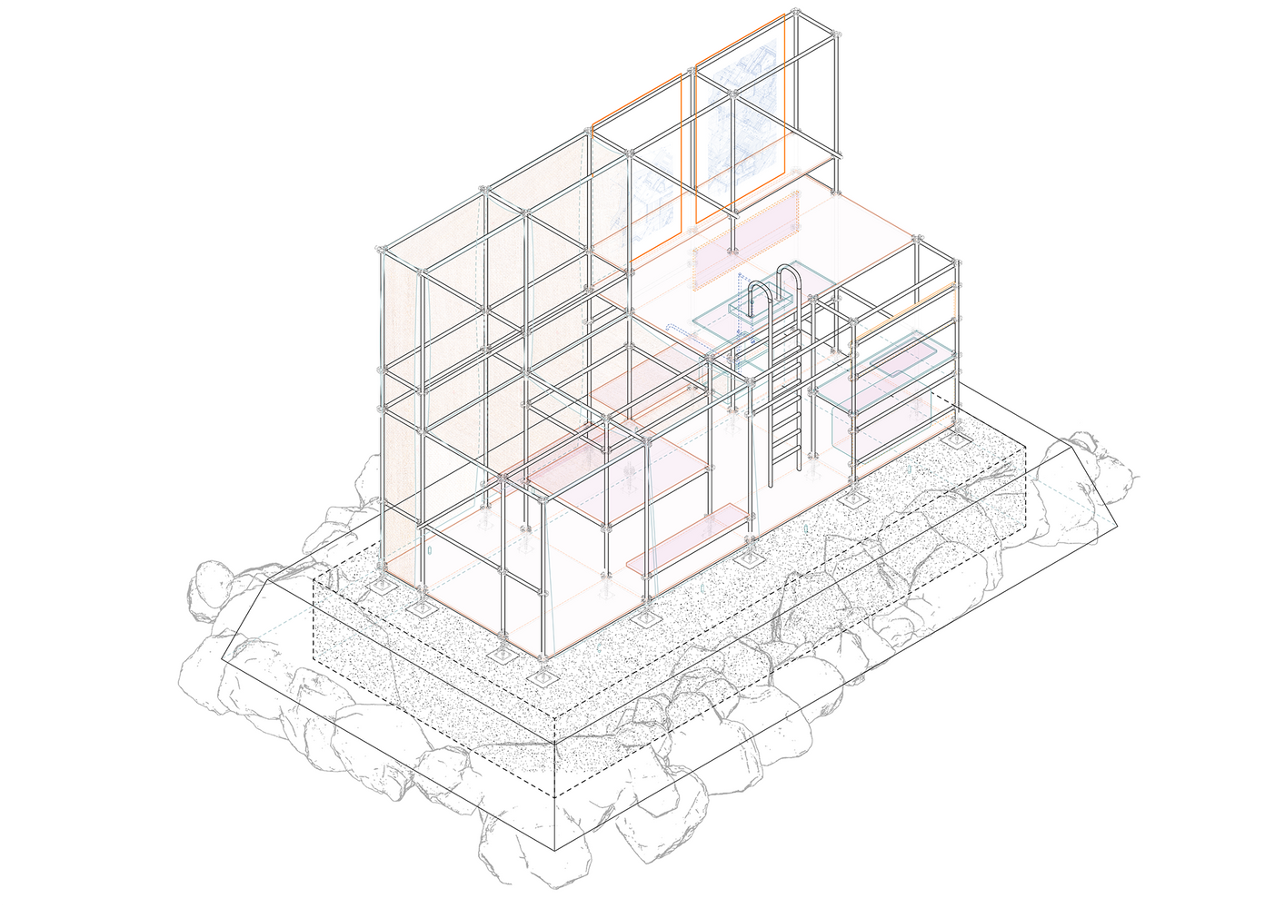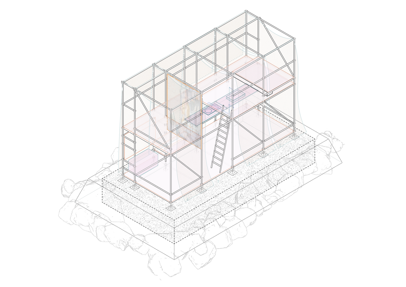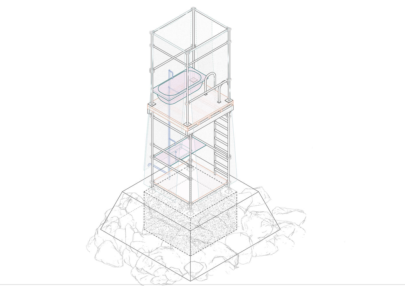A small summer school of architecture operates as a residency program. A limited number of students work with scaffolding elements to explore innovative ways of constructing a lightweight, experimental system of fragmented domestic spaces and open-air lecture and dialogue settings. The scaffolding pieces are designed to click and plug into more stable, permanent platforms scattered across the island, providing a solid foundation for these abstract rooms in the landscape. Inside the island’s warehouse, fabrics and simple apparatuses are stored—easily adaptable to an improvised water system. In this way, a bathtub or a sink can be installed atop a tall structure, offering a chosen view to unfold while the objects are in use. Each group can build upon the traces of the previous one, transforming withdrawal into a collective experiment in impermanence, memory, and reimagined domesticity.
