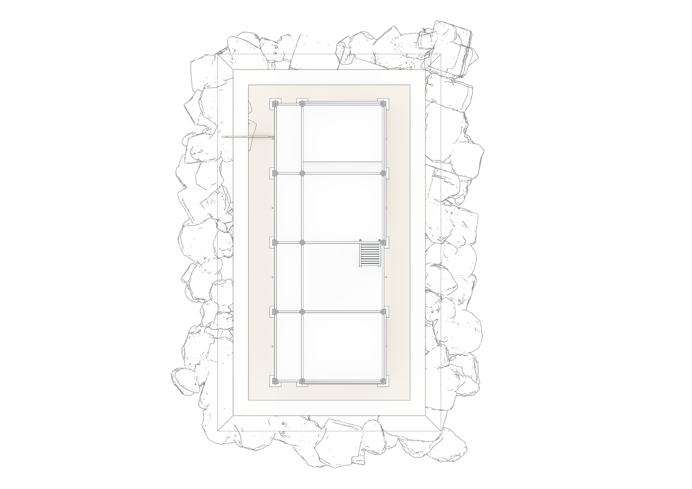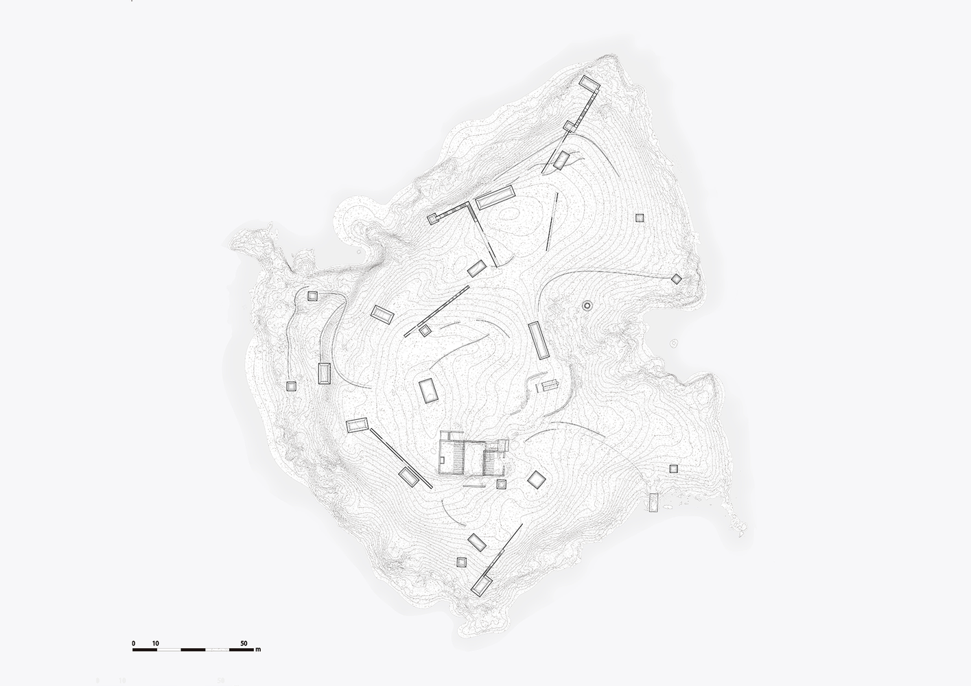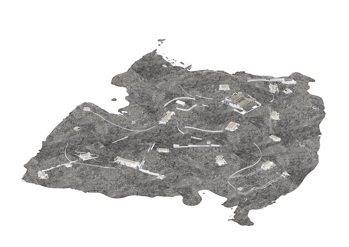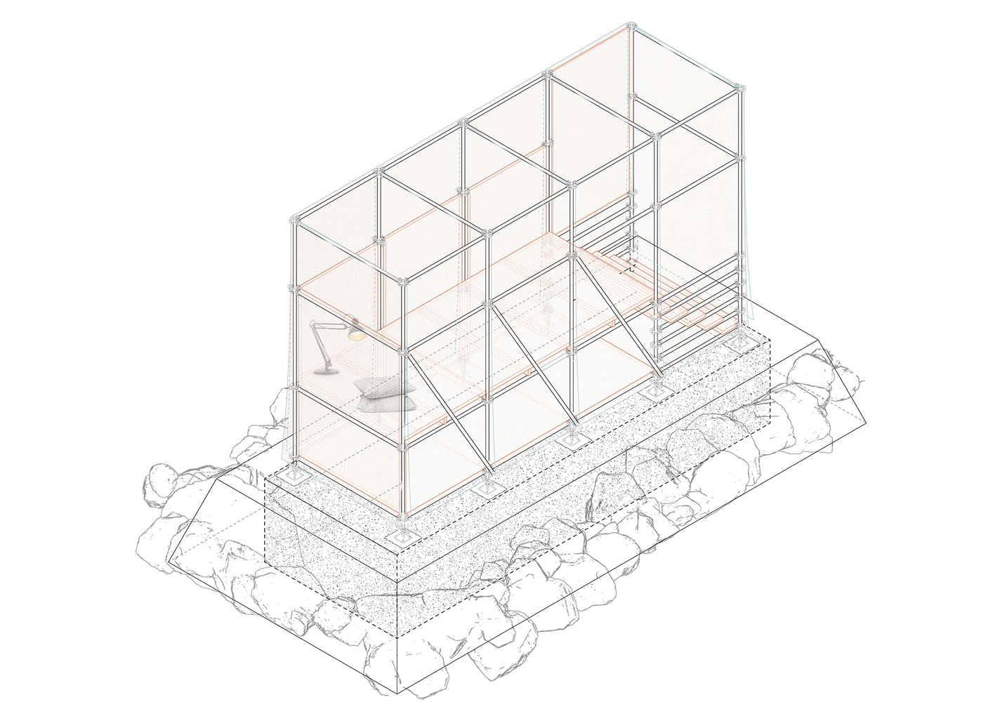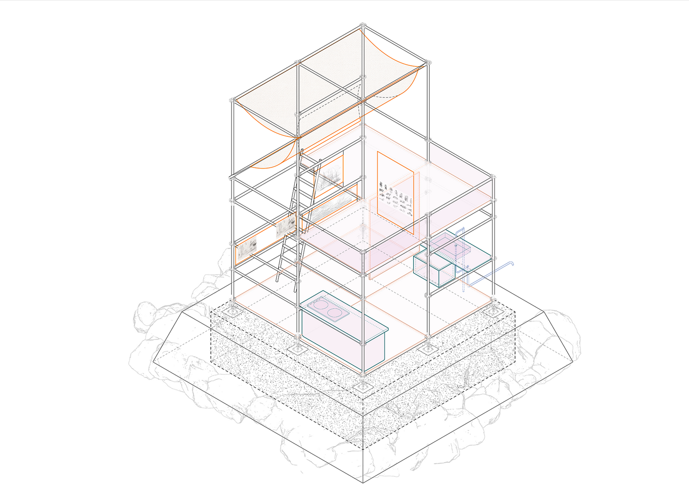 A small summer school of architecture operates as a residency program. A limited number of students work with scaffolding elements to explore innovative ways of constructing a lightweight, experimental system of fragmented domestic spaces and open-air lecture and dialogue settings. The scaffolding pieces are designed to click and plug into more stable, permanent platforms scattered across the island, providing a solid foundation for these abstract rooms in the landscape. Inside the island’s warehouse, fabrics and simple apparatuses are stored—easily adaptable to an improvised water system. In this way, a bathtub or a sink can be installed atop a tall structure, offering a chosen view to unfold while the objects are in use. Each group can build upon the traces of the previous one, transforming withdrawal into a collective experiment in impermanence, memory, and reimagined domesticity.