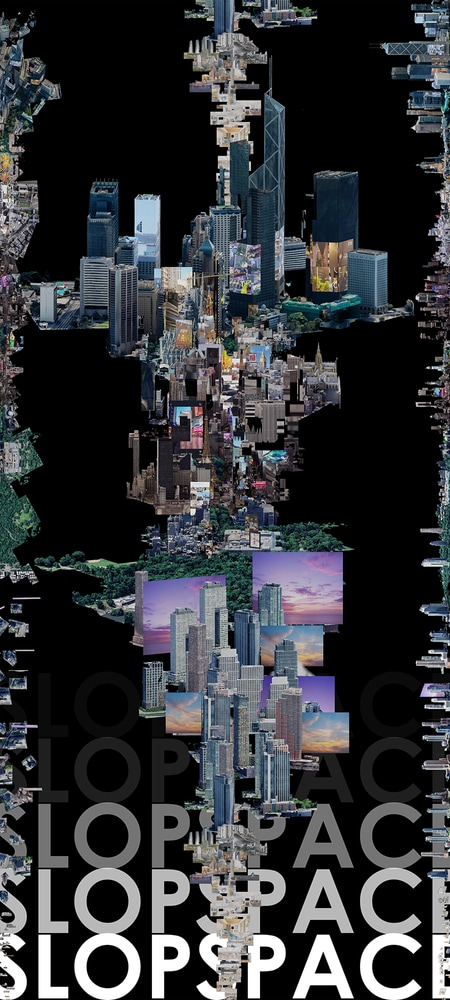 Slopspace is not confined to screens, it infiltrates cities, interiors, domestic life, leisure, labor,and natural environments. It is built from magic hour skies, social media trends, viral hotpots,branded interiors, AI hallucinations, Insta-repeats, failed competition proposals, saturated urban landscapes, advertisement billboards, artificial natures, trees on skyscrapers and real estate renders optimized for desire extraction. Public space dissolves into feeds, architecture is not lived, but shared and streamed. Slopspace is an after image of capital, a spatial condition shaped by the exhaustion of attention and the automation of desire. As both symptom and possibility, Slopspace marks a threshold: not just of how architecture is visualized, but of how it is lived, extracted, and ultimately undone. As images accumulate and accelerate, the very notion of space begins to collapse, either into implosion through overproduction, or into a cultural numbness where nothing registers.