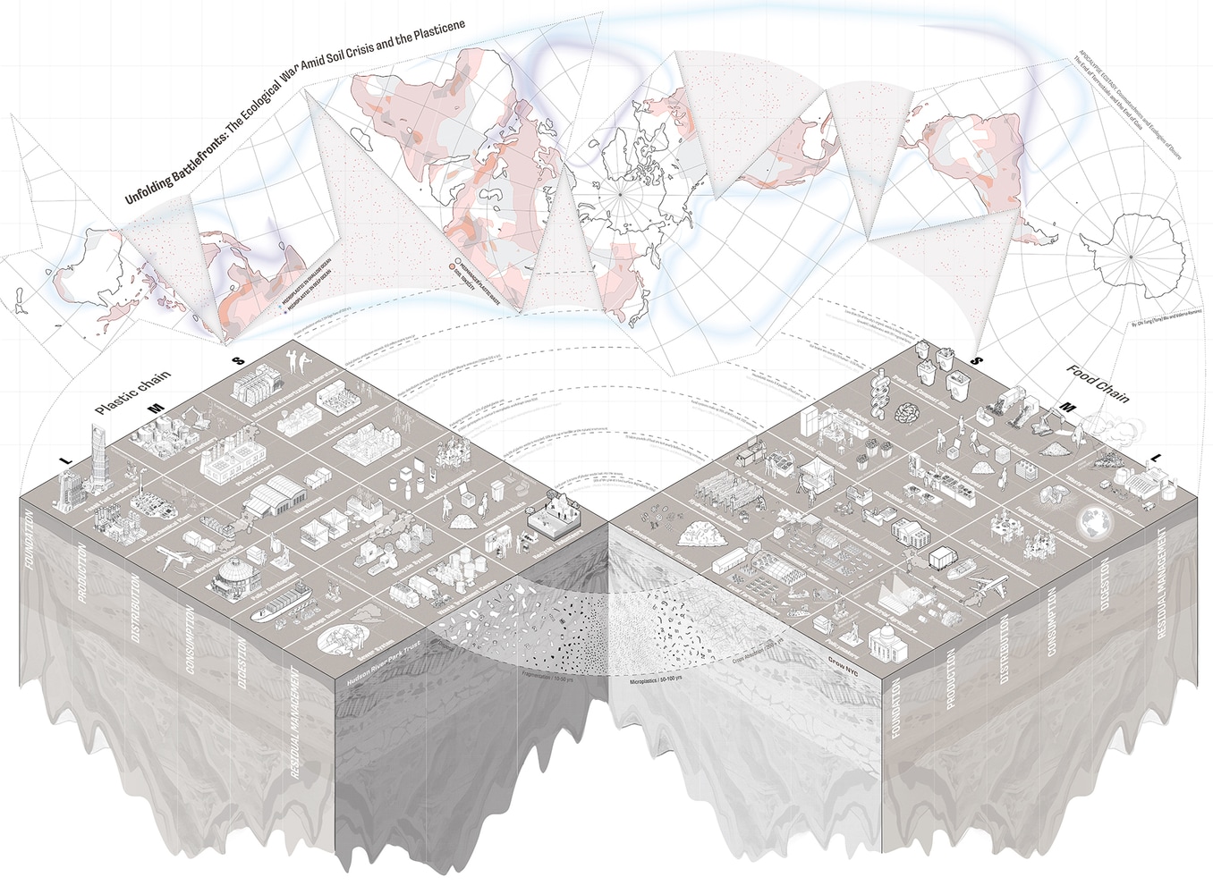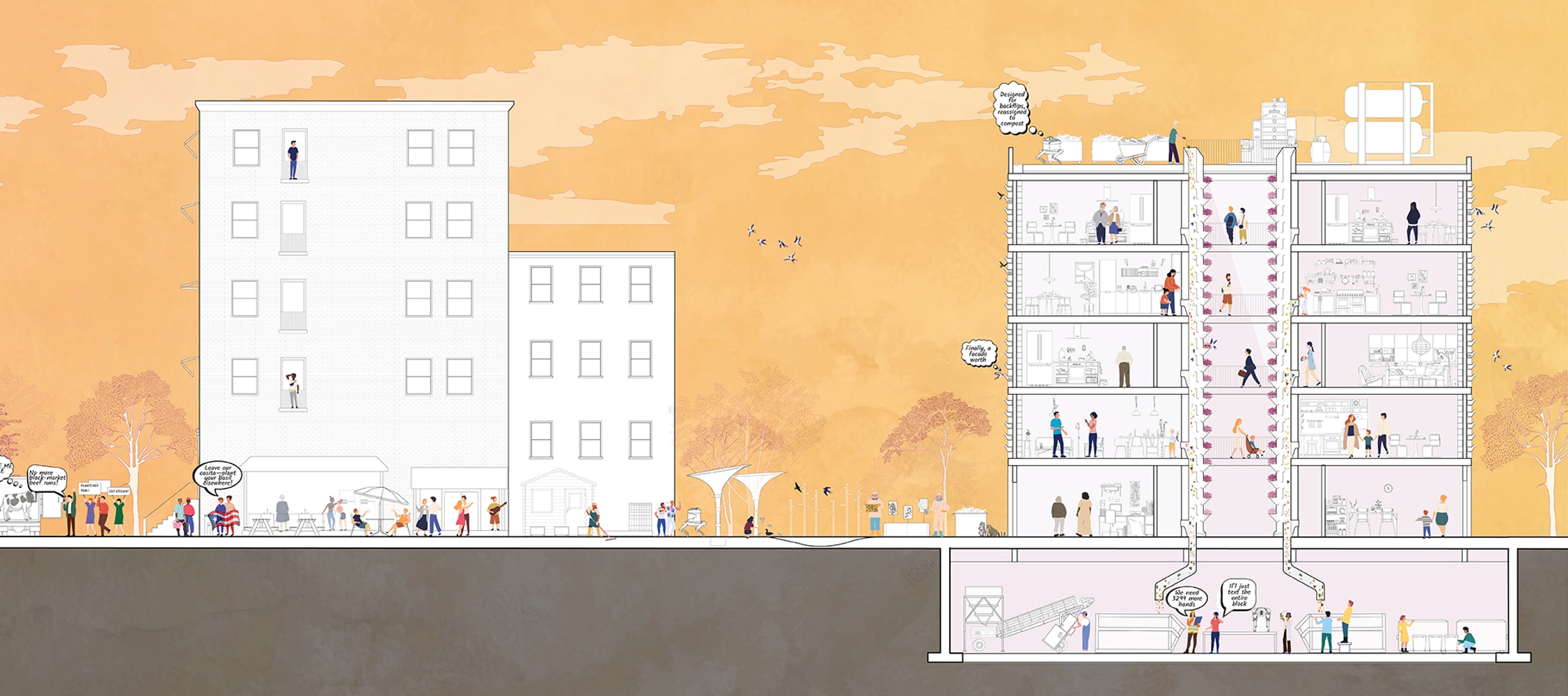 Through a speculative Crisis Cabinet, five figures representing different perspectives: a plant-based advocate, an animal defender, a meat eater, a member of the Puerto Rican community, and a composter, are invited to negotiate what food sovereignty might look like. Their debate reveals the conflicting demands between ethics, property, space, and labor. A series of urban sections grounded in real data reveals the scale of transformation needed: for instance, over 36 hectares of land would be required to sustain animal-based diets locally, while a fully plant-based system would still demand that over 70% of the neighborhood’s land be dedicated to food production. These sections challenge the assumption that food self-sufficiency is simply a matter of access, they show how it would radically reshape urban life.