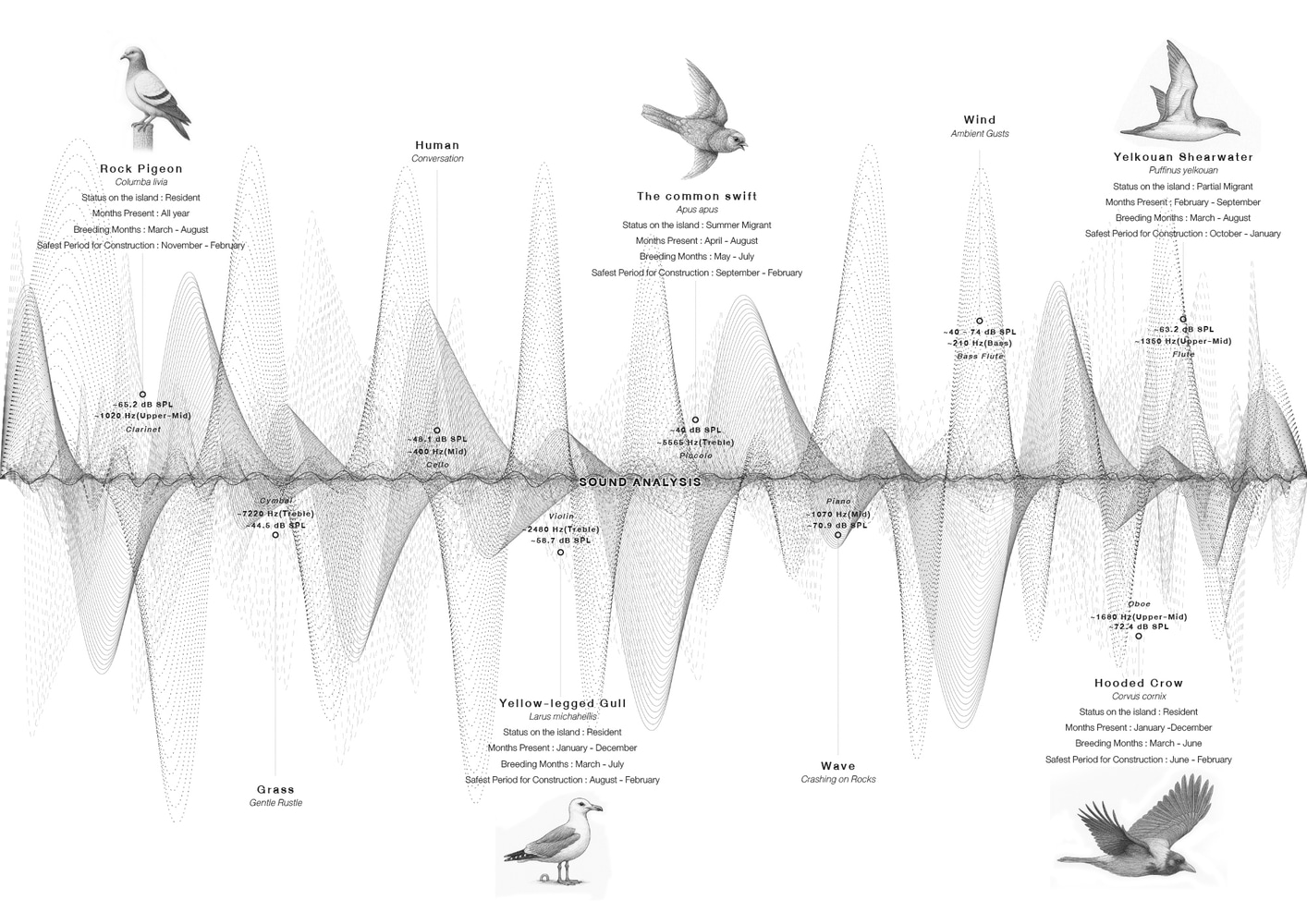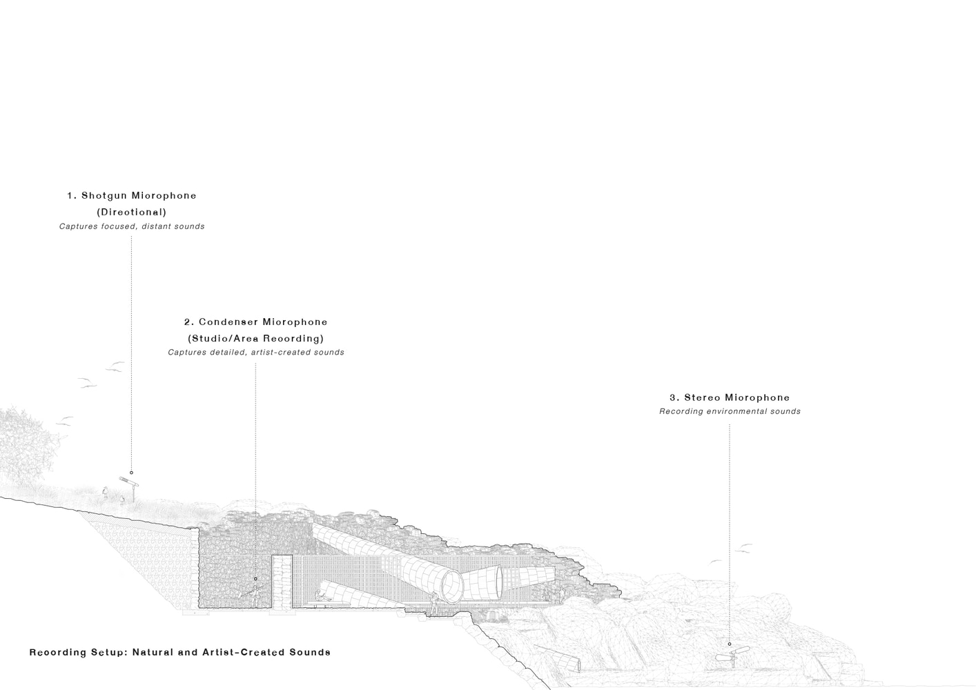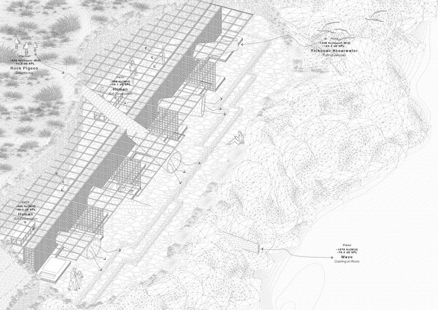 The Sound Field is more than an architectural intervention; it is a sonic ecosystem, a place where listening, composing, and coexisting unfold as one continuous act. The desert island of Kivotos becomes a living archive of natural sounds, meticulously recorded and transformed into a layered, evolving soundscape. A residency program invites students and practitioners of electronic music to inhabit the island, composing and performing works drawn directly from its acoustics. Here, music-making begins with attentive listening to wind, stone, water, and birds, and extends into a shared exploration of sound as a way of dwelling. The residency culminates in small-scale concerts, where intimate audiences gather to experience the island’s sonic textures as both material and performance. THE SOUND FIELD INVITES US TO INHABIT A LANDSCAPE NOT ONLY PHYSICALLY, BUT ACOUSTICALLY.