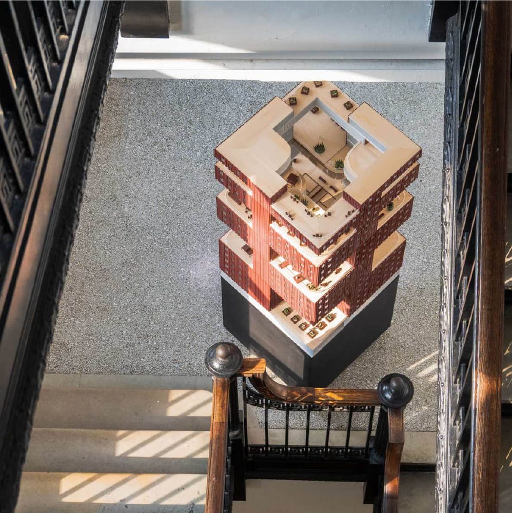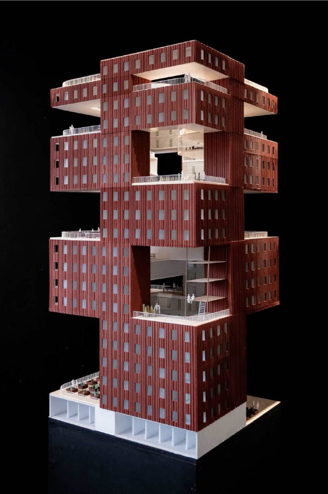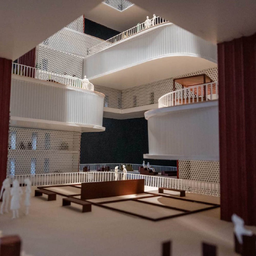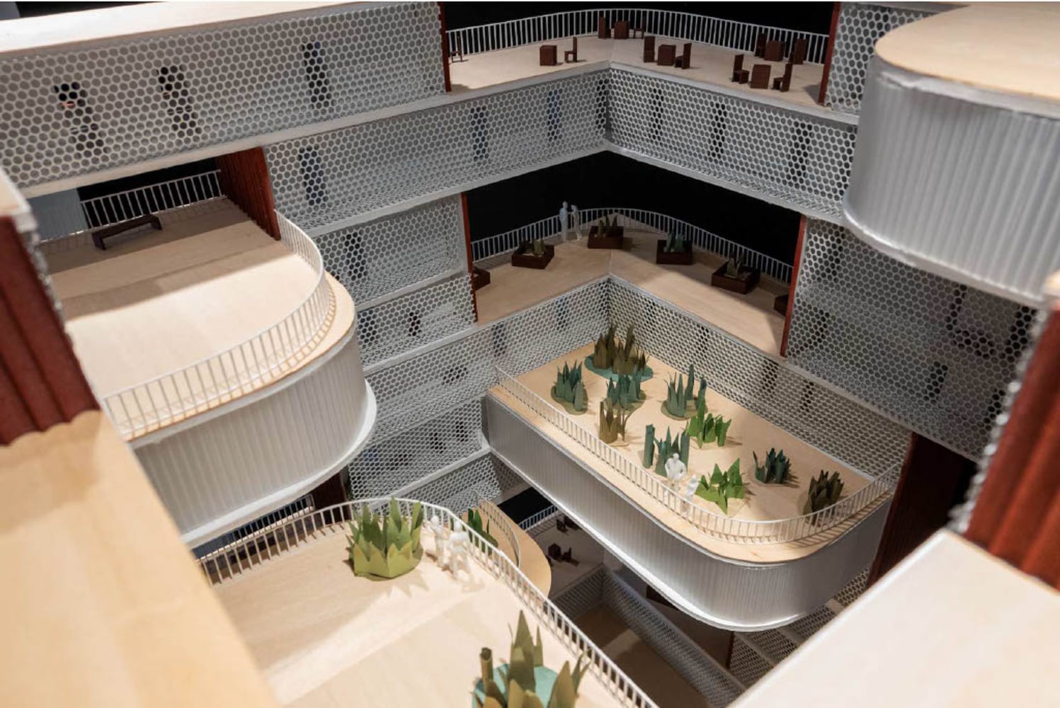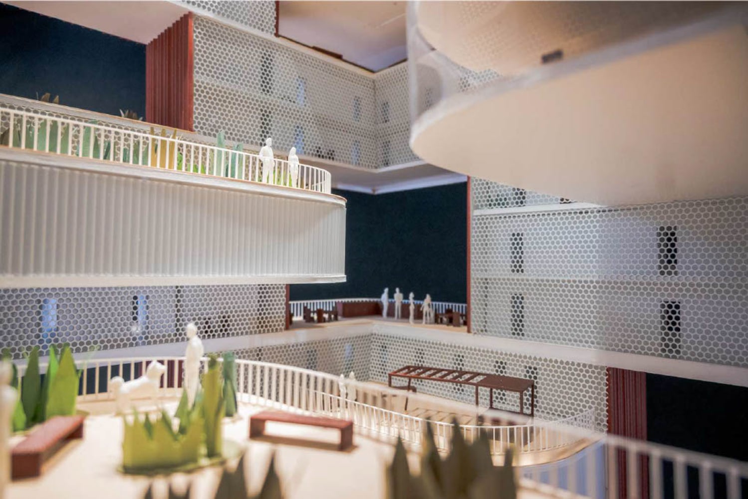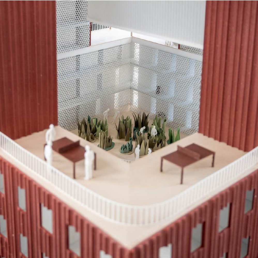Designed with immigrant communities in mind, the building frames housing as both shelter and social infrastructure. Kitchens are positioned at the courtyard edge as primary sites of congregation, recognizing food as a universal practice that reduces isolation and supports cultural continuity. Program is organized across three scales of sharing: (1) room pairs that share a bathroom, (2) clusters that share micro-kitchens and dining, and (3) building-wide amenities—such as a fresh-food market, library, sport areas, and small parks—strategically clustered at sheared corners. These nodes concentrate activity and extend it outward through “leaky” terraces and patios, allowing interior life to register in the public realm.