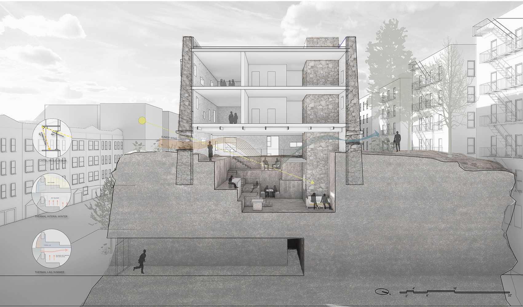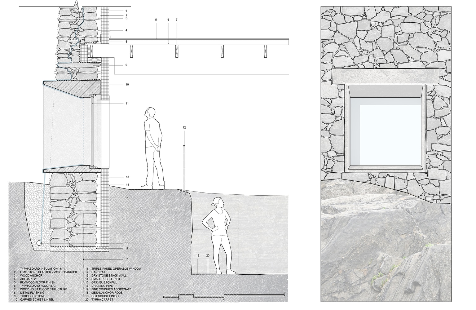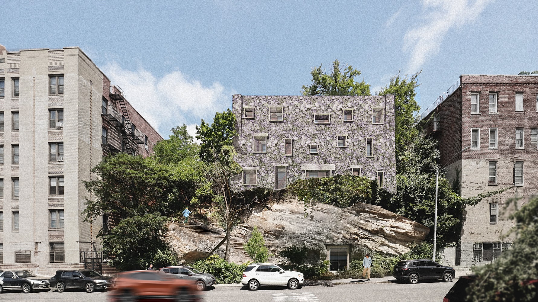 ‘Inhabiting Manhattan Schists’ brings the quarry into the city by engaging Manhattan’s overlooked schist outcrops. The presence of schists has played a significant role in the city’s terrain, skyline, nature, and infrastructure, yet modern construction favors imported luxury stone as a form of cladding, undermining the structural and sustainable capabilities of local stone. The project reclaims an outcrop as both extraction site and construction ground, eliminating the need for material transport and reducing carbon emissions. Through embracing low-tech, low-impact methods with stone, such as feather and wedge stone splitting, dry stone stacking, and traditional stone carving, the work redefines what “extraction” means in the urban context: not only removing stone but transforming it into a cycle of building, inhabiting, and memory. This approach embraces endogeneity, reframing geology and cultural history as drivers of sustainable, inhabitable design.