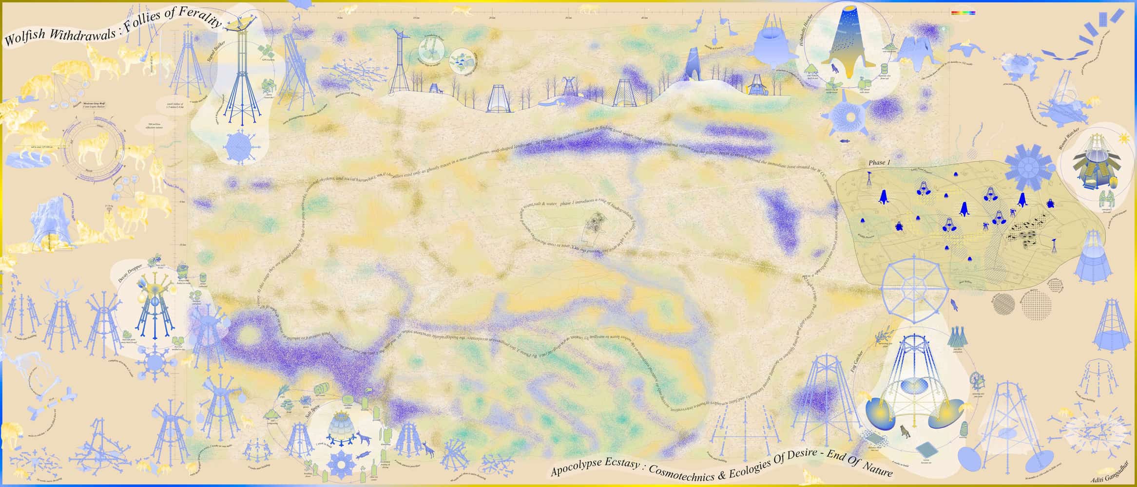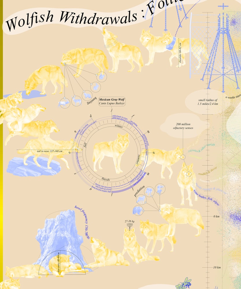Wolfish Withdrawals – Follies of Ferality is a proposal that imagines rewilding as a designed process, a sequence of structures that experience a birth and death cycle rather than standing as permanent fixtures. The proposal introduces six biodegradable follies, placed in phases just outside and around the Wolf Conservation Center’s fence line, forming a transitional ring to coax wolves out of their enclosures and into a self-directed range. Each folly is grown from interlocking mycelium units, their branching geometries inspired by deer bones and antlers, a tactile echo of prey and the cycles of life and death that sustain the wolves. Inside each unit is a calcium-rich core which is a hidden chewable prize that only emerges when the mycelium softens and melts away, turning the disintegrating structures into enrichment objects for the wolves themselves. These units merge upward into stump-like conical forms, recalling the hollow tree stumps where wolves often seek shelter in the wild. The six follies serve distinct roles: the clay Helmholtz Howler amplifies howls across the landscape; the Fog Catcher drapes hessian netting over a mycelium cone to harvest fog and dew into drinking water; the Salt Spire offers mineral licks, deliberately drawing deer and other prey closer to the wolves; the Signal Stalker rises as a decaying satellite mast- a ghost of surveillance slowly reclaimed by moss; the Wound Watcher provides a discreet first-aid hut for rare human intervention; and the Decay Dropper releases meat via wax corks that melt away in timed stages, teaching wolves to scavenge. Each folly has a life arc. Some live briefly, the Salt Spire dissolves in rain and under deers’ tongues within months, and the Decay Dropper exhausts its wax corks in weeks. Others endure longer like the Helmholtz Howler’s clay shell cracks and erodes over years, the Signal Stalker slumps slowly into moss-covered ruin once the satellite dish is taken away, and the mycelium frames beneath them all soften and collapse into the soil, revealing the calcium cores as chewable remnants for the wolves. This phased placement is deliberate: early follies like the Salt Spire and Decay Dropper lure wolves just beyond the fence, while the longer-lasting structures : Howler, Fog Catcher, Signal Stalker, become fading waypoints as the wolves expand their range from 15 to 45 square kilometers. By designing for impermanence, Wolfish Withdrawals frames architecture as a scaffold for freedom, structures that grow, serve, and then rot away, leaving no scars as the wolves finally withdraw fully into their wild instincts.