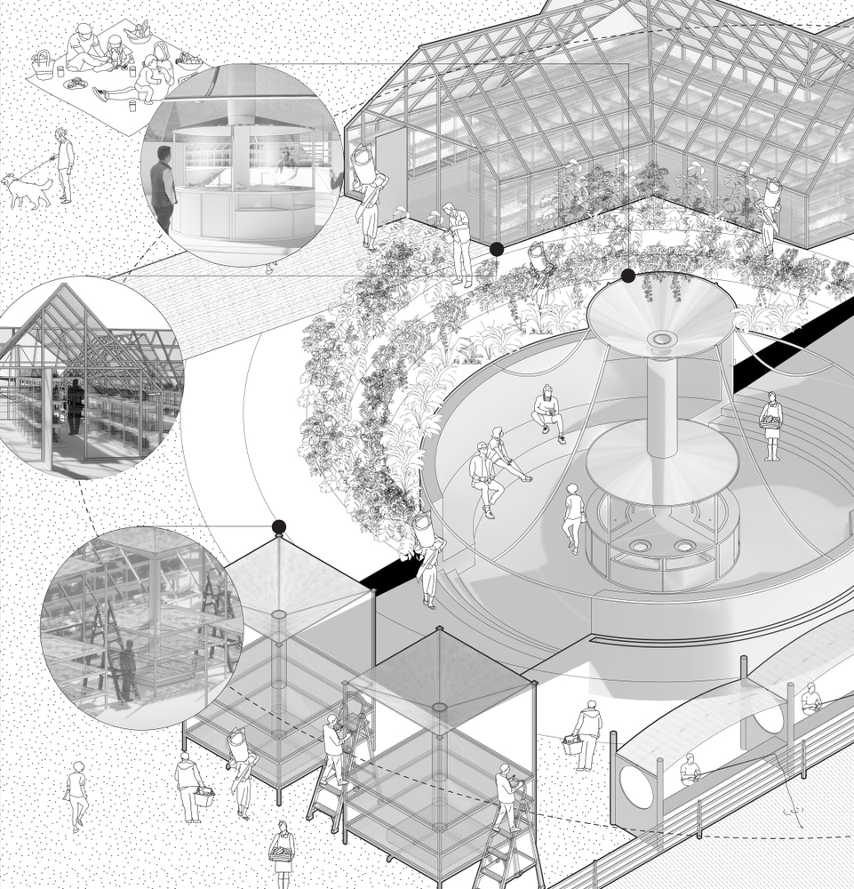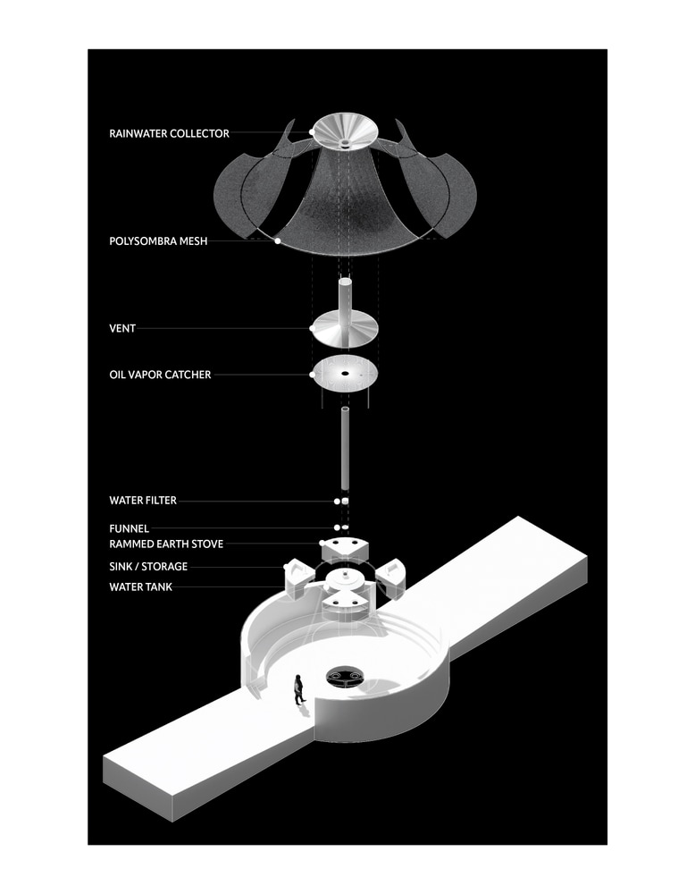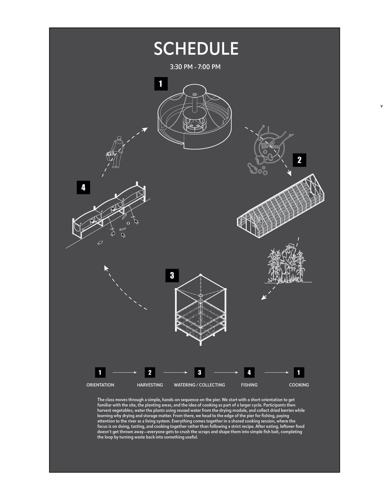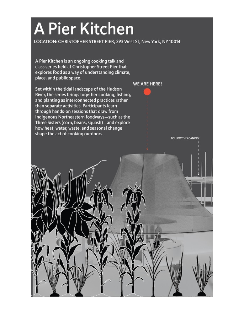 Pier Kitchen reconsider thermal comfort as a continuous gradient shaped by environmental variation. Located on the Christopher Street Pier, the project consists of five chambers: cooking, two greenhouses, drying, and fishing, into a sequential system that responds to heat, humidity, and ventilation. The warmest chamber, which is a cooking unit, contains a rammed earth stove created from excavated ground whose rising heat and steam are captured by a fog catcher (polysombra mesh) and filtered through an oil vent, treating cooking as both a thermal and spatial operation. Near greenhouses form a mild zone, using varied enclosures to mitigate cold air and river winds, while supporting indigenous three sister farming system. Cooler chambers accommodate drying and fishing units, where fog and rain are collected, filtered, and reused for irrigation. Together, these zones construct a spatial narrative in which climatic variation becomes an active design strategies rather than a condition to be stabilized.