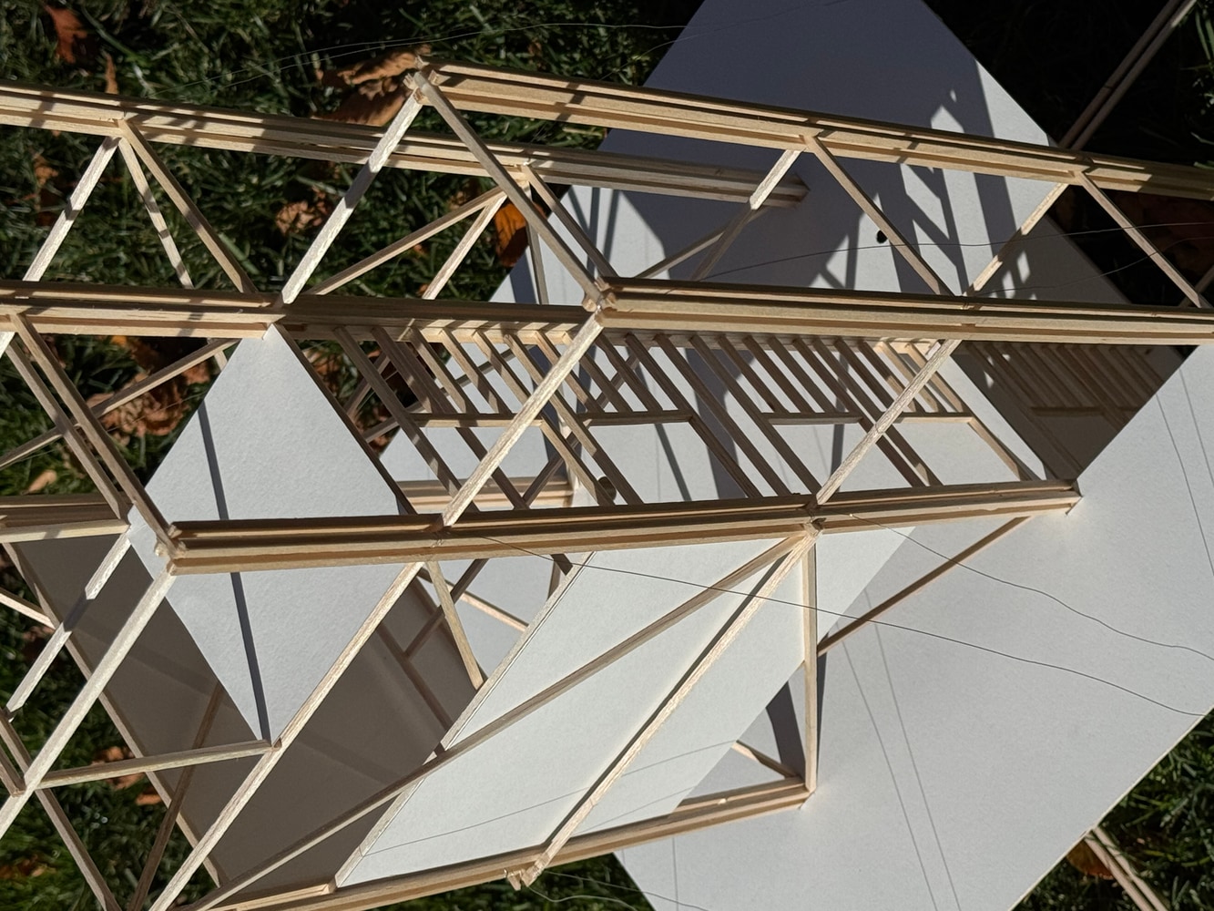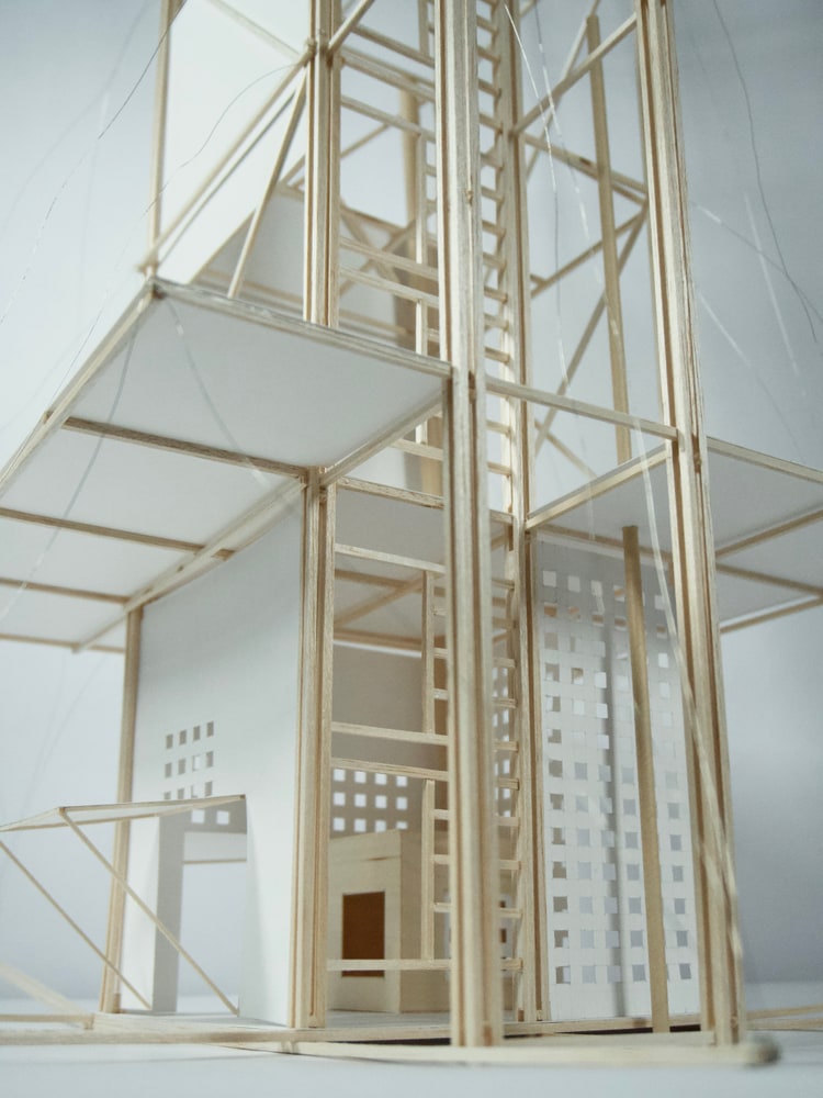 The tower responds by harvesting the pier’s abundant sunlight, wind, and rainfall to provide these missing amenities: shade, seating, illumination, and radiant warmth. It also changes its features, adapting different seasons. Built from leftover scaffolding materials sourced from nearby building maintenance, the structure is assembled from 5’×5’×5’ modules cut from standard wood planks with zero waste. Cored concrete blocks slot seamlessly into the modules, while wood offcuts from the joinery are recycled on-site into steam-exploded pine fiber board for seating surfaces.”