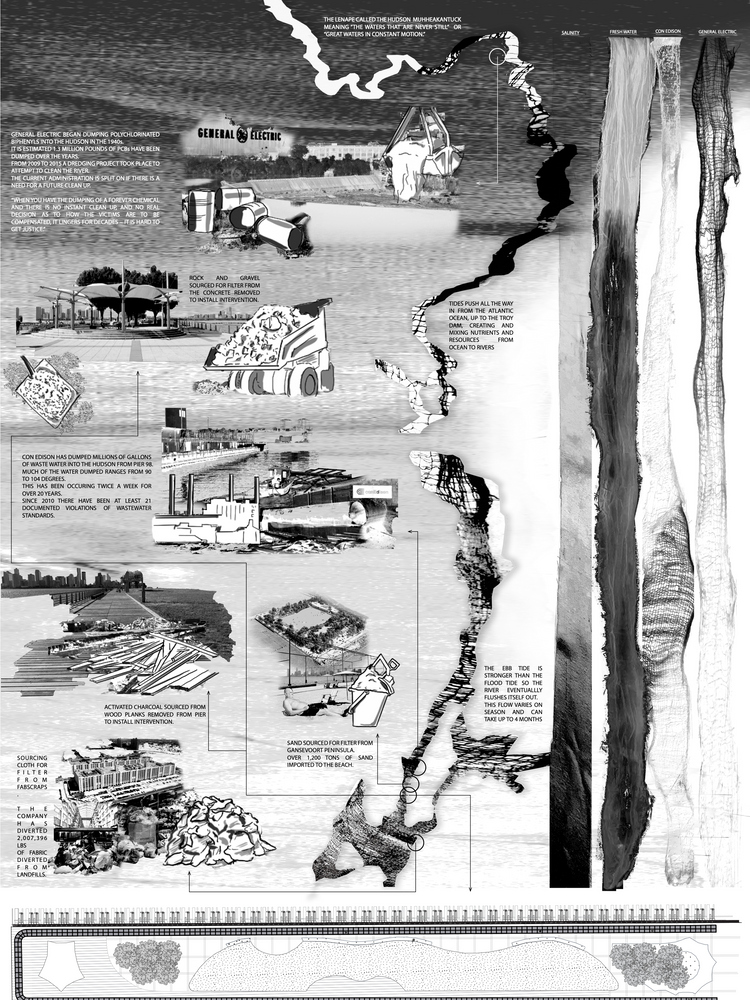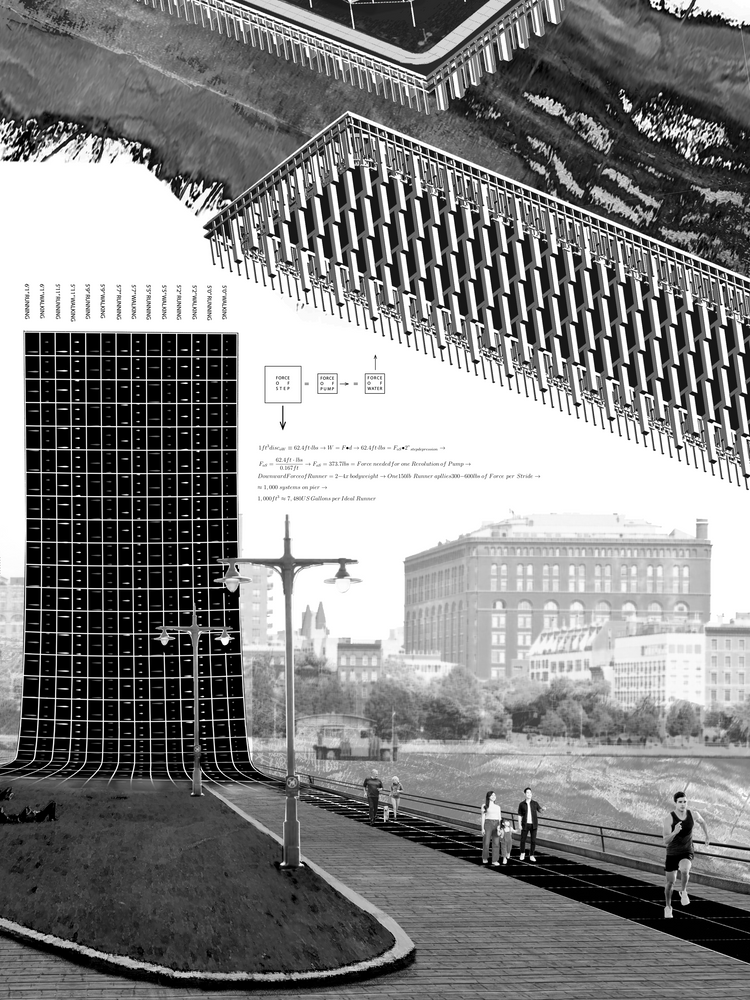 This intervention examines the effect of a single motion and how its impact ripples throughout the environment. It is a series of filtration systems that sit beneath the Christopher Street Pier; each system is connected to a tile on a running track above the pier. Whenever a tile is compressed down, it causes a pump beneath it to rotate and press water vertically into a reservoir tank. The water moves from the reservoir and through layers of rock, sand, and concrete in order to remove pollutant particles and then it returns back to the Hudson. This intervention was inspired by the lack of policy in place to protect the Hudson from factories such as General Electric and Con Edison. While it may not seem significant to filter and return water to the same location, the constant motion of the tides will begin to spread the filtered water upstream and downstream.