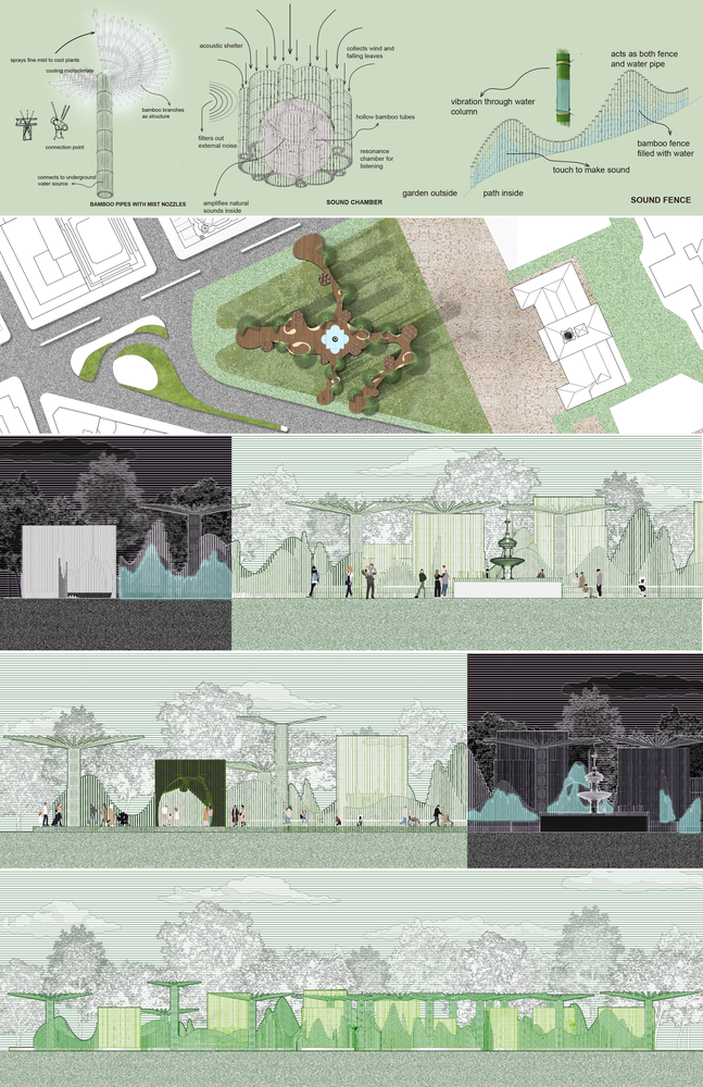 1 This work uses broken porcelain and vegetation to explore fragility and renewal between humanity and nature. A shattered mask and vase become a vessel of repair, where damage gives rise to resilience, healing, and the possibility of coexistence through care and regeneration;2 Symphony of Bamboo” explores bamboo’s hollow structure as a living medium of sound, water, and air. Through interactive sound, wind capture, and cooling mist, the garden becomes a breathing system where material intelligence shapes ecological, sensory, and emotional architecture.3
