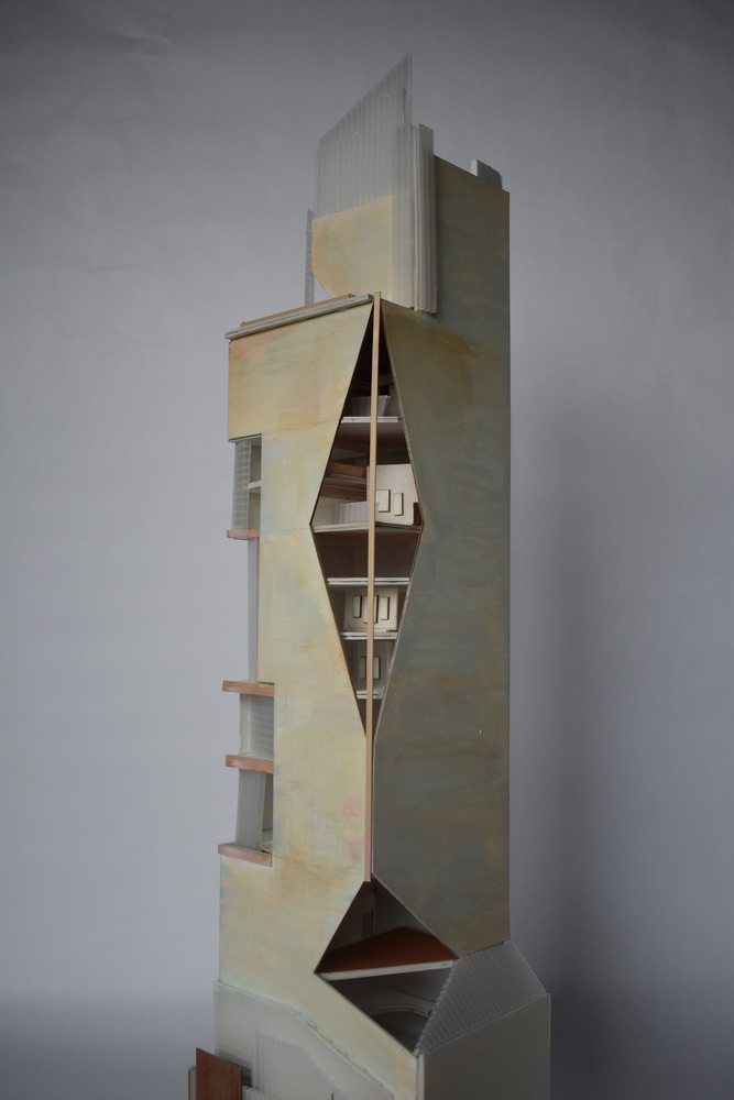 The Museum of Arab American Performance illuminates histories and ongoing cultural expressions within the Arab American diaspora through a specific focus on the performing arts. The project proposes a vertical museum and performing arts center situated on the former site of the Little Syria colony in Lower Manhattan. The building, itself, performs through layered transparencies, suspended fragments, and framed views that recall stagecraft and scenography, while crafting a kinetic sense of cultural memory for both visitors and artists. Double-height museum galleries form adjacencies to contemporary modes of performance like dance, song, film, theatre, and oral storytelling. Sculptural circulation paths, salvaged building marquees, and decorative fragments from 20th-century works of Arab American theatre are all recontextualized as ‘set piece’ boundaries; selectively framing moments of visual continuity between spaces of archive and performance. Each level is encountered as a narrative threshold between different modes of visibility: rehearsal, exhibition, storytelling, and making.