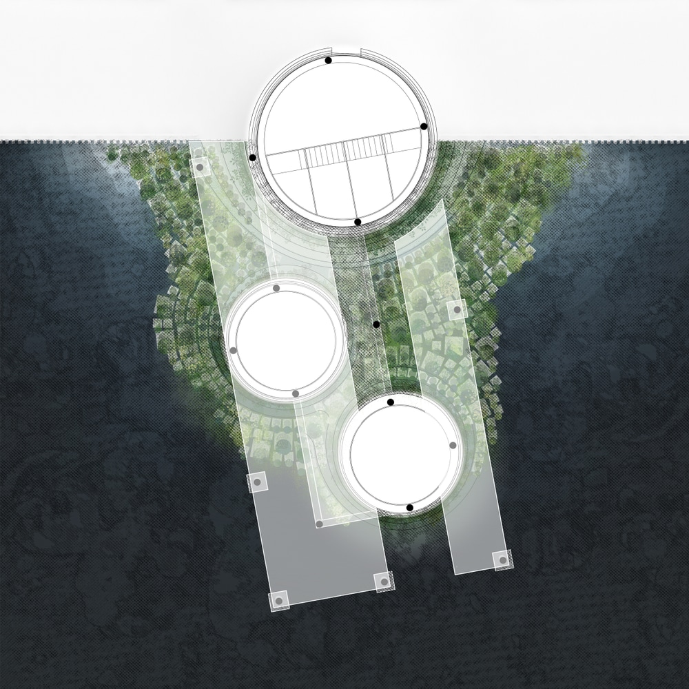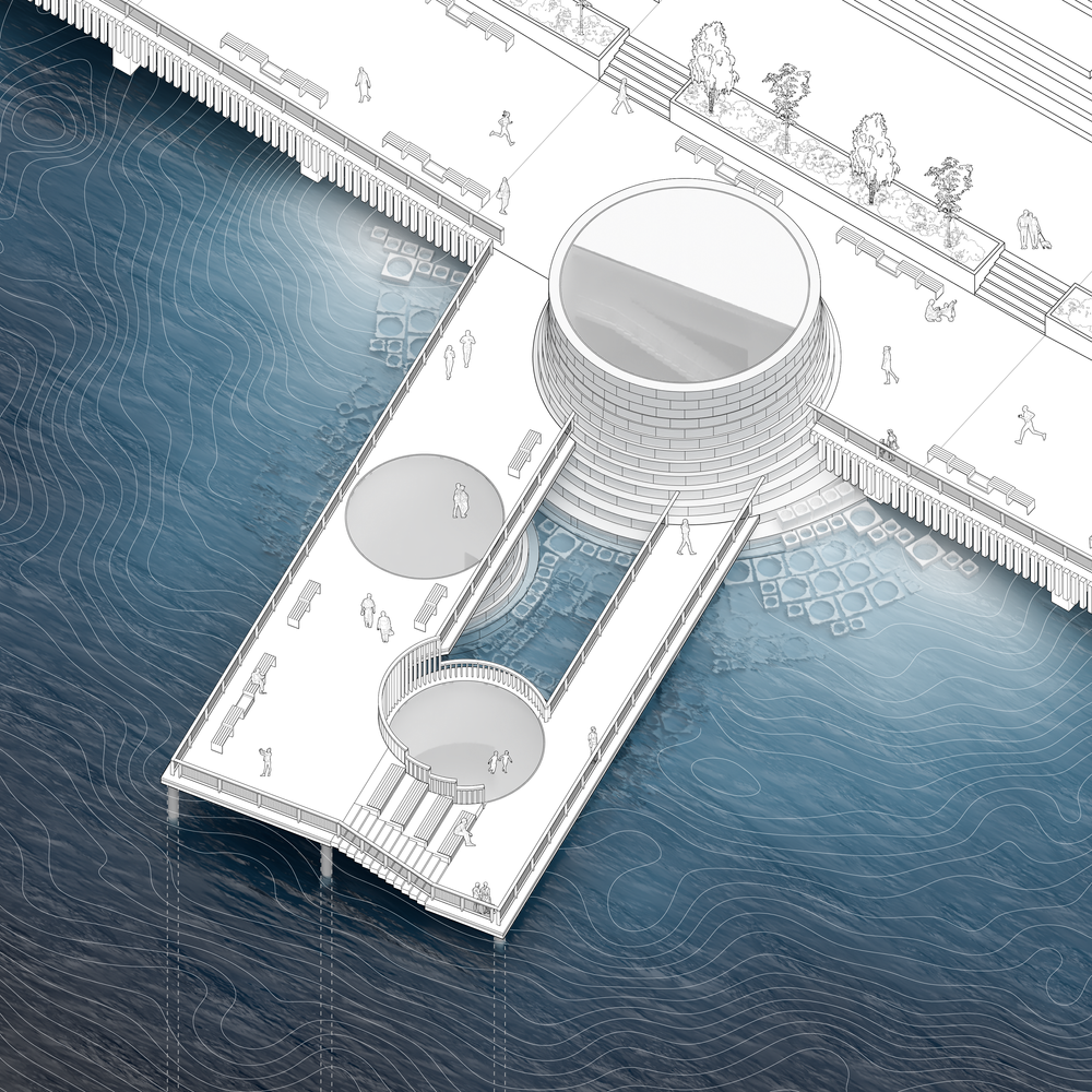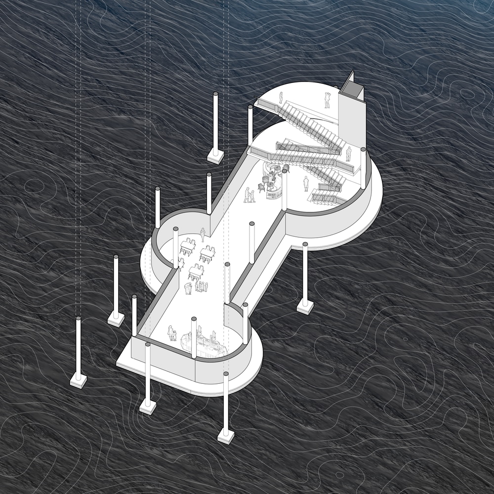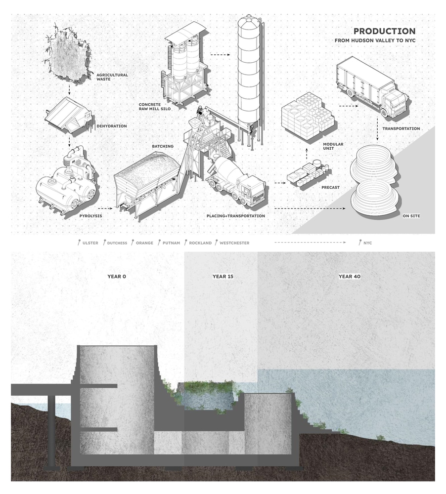 This Rising Intertidal envisions an intertidal education and remediation landscape at Domino Park, where biochar concrete made from Hudson Valley agricultural waste mediates between carbon sequestration and coastal restoration. Terraced geometries and biochar concrete cells generate self-sustaining intertidal habitats while linking rural biomass cycles to urban ecological repair. Over time, rising sea levels gradually shift the project’s role from public learning space to long-term underwater restoration, allowing the architecture to transition from civic infrastructure into an enduring ecological system.
