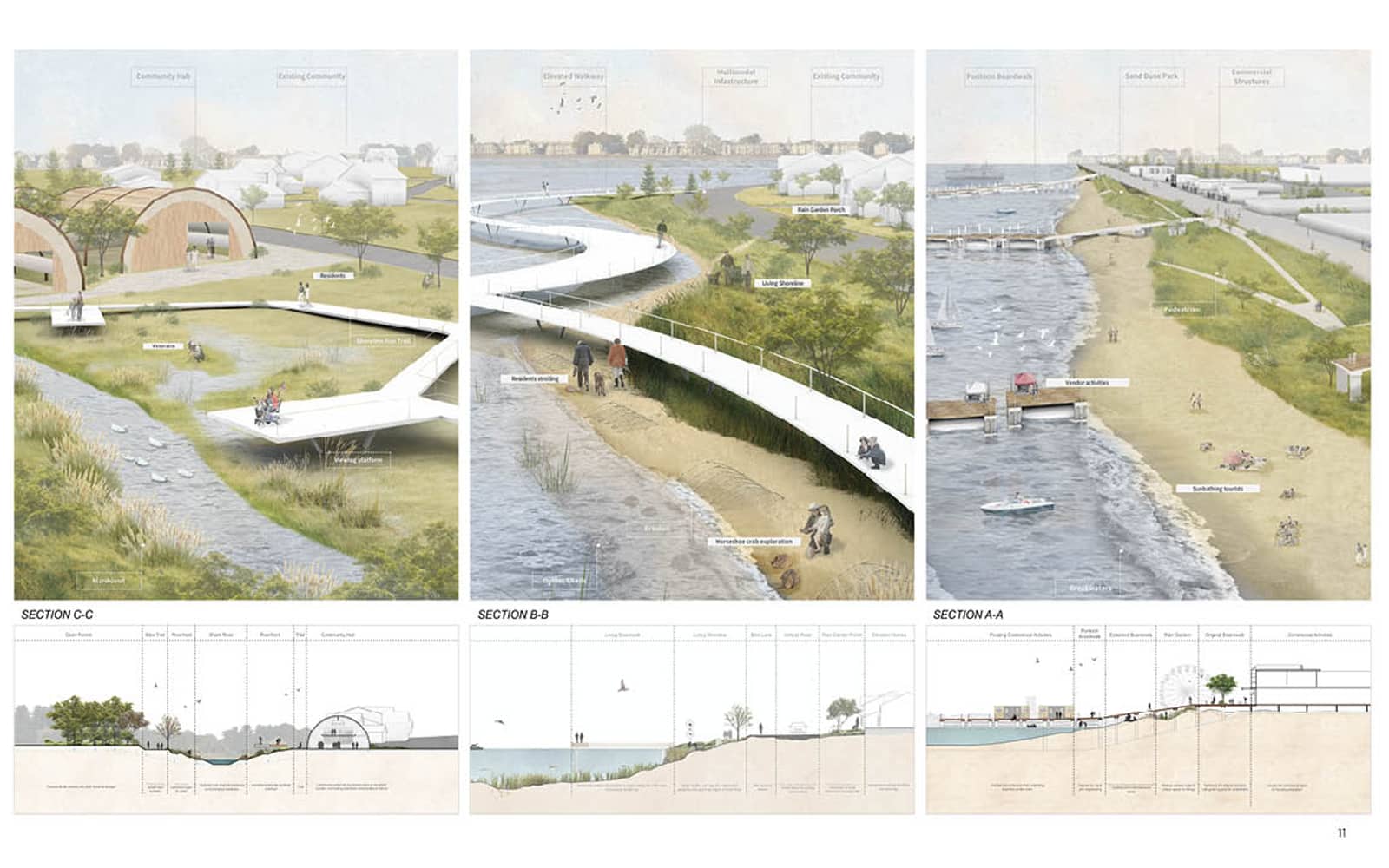 Stewards of the Coast reimagines the Asbury Park-Belmar Beach shoreline, extending to the Naval Weapons Station Earle, as a climate-safe community led by veterans. The project responds to a fragmented landscape – upland defense terrains, a suburban estuary, and a littoral frontline – each intensifying regional flooding. Meanwhile, veterans have long defended this coast, and have the engineering, logistics, and management skills required to build resilience. Through veteran-led stewardship, we transform a land that stored weapons into one that heals people and places. Flood-prone creeks are transformed into hybrid marsh–parkland systems that connect protected forests to the Shark River and the Atlantic coast, while amphibious and fortified coastal infrastructures stabilize the boardwalk economy. Strategically located community hubs, inspired by military bunkers and within veteran-dense neighborhoods, anchor new civic life and stewardship networks. By mobilizing veterans as stewards, builders, and coordinators, the project demonstrates how incremental, place-based interventions can strengthen ecological systems, support local economies, and foster long-term community resilience across the Jersey Shore.