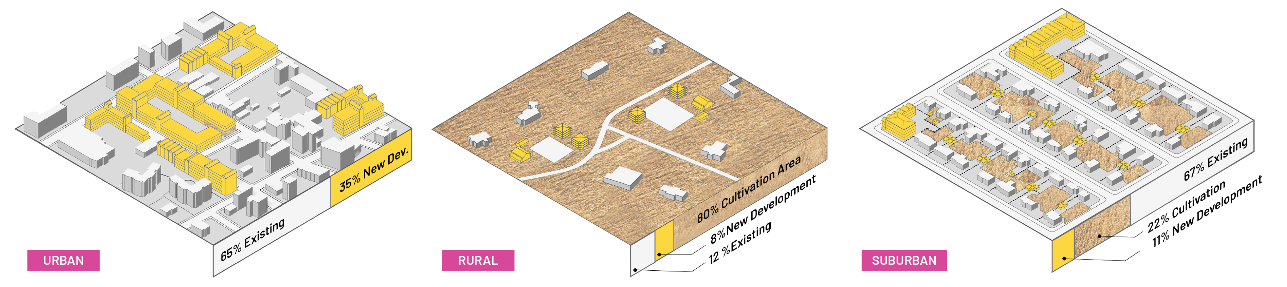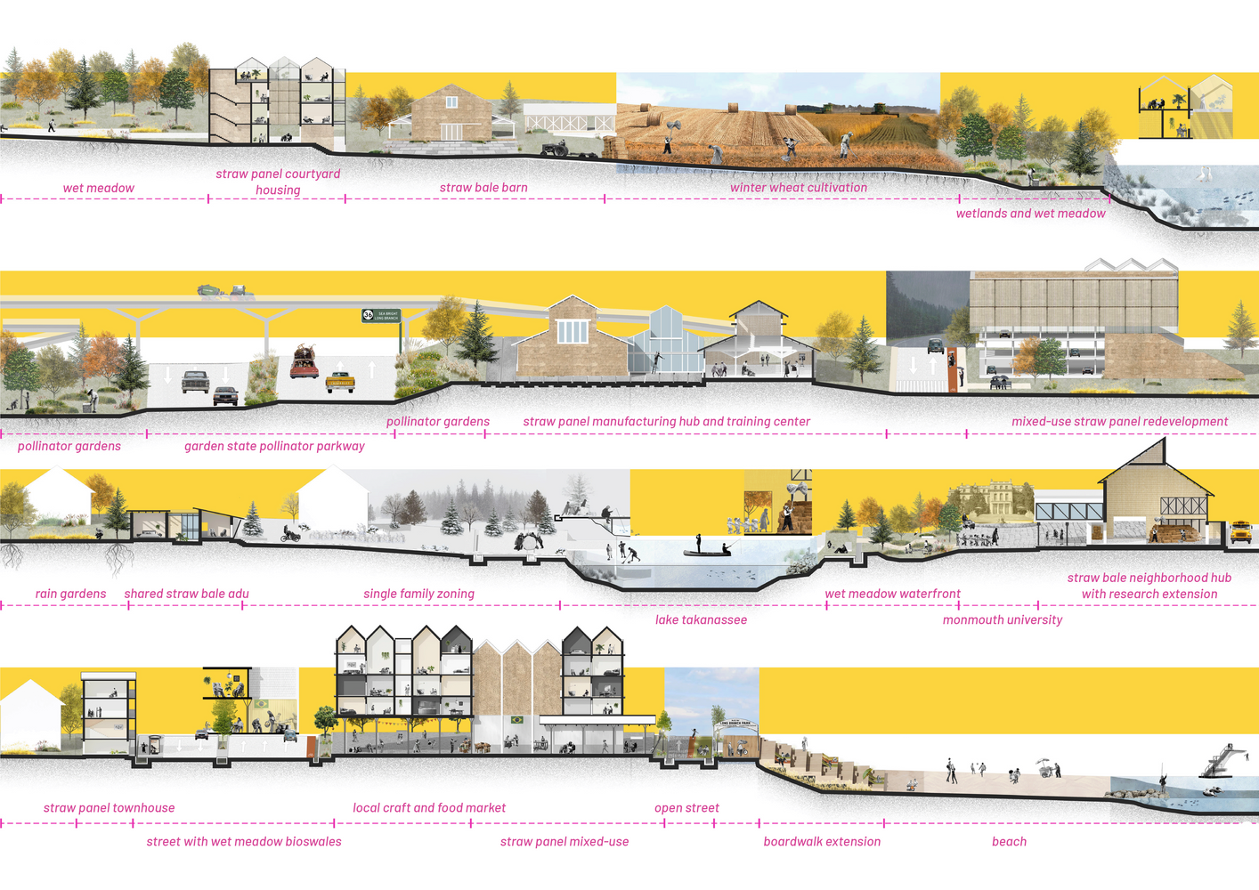 The Bale Trail explores the material domain of urban design, and what it means to grow a resilient future. Looking beyond its summer-centralism, the earth revealed the region’s agricultural potential, and the opportunity to use preserved farmland as a catalyst for new forms of development. Locally grown straw serves as a sustainable construction material, offering a carbon-negative alternative to conventional building systems. The project also proposes shared Accessory Dwelling Units that incentivize homeowners in the suburbs to build ADUs and open up backyards to longer grasses for shared harvesting, supporting aging in place and strengthening long-term community ties. Fields, meadows, rain gardens and long grasses make ecology visceral, allowing people to visualize and understand how human actions shape environmental futures. By integrating cultivation, construction, and education, the project envisions a model where agricultural practices not only shape the built environment but also engage and inspire younger generations.